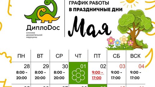 График работы клиники на майские праздники ☀️ Пожалуйста, учтите изменения при планировании визита. 1 мая – выходной 9 мая – выходной 2 и 8 мая – с 9:00 до 17:00 Записаться на приём или уточнить информацию: 🟢Телефон – 8(846)300-44-30 🟢WhatsApp (только текстовые сообщения) – https://wa...