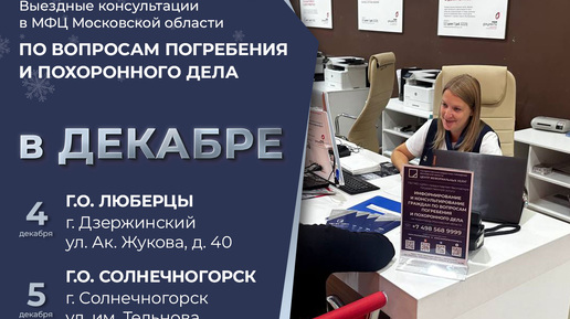 Прием граждан в МФЦ Московской области для консультации по вопросам погребения и похоронного дела Государственное бюджетное учреждение Московской области "Центр мемориальных услуг" информирует о предстоящих выездных консультациях, которые пройдут в многофункциональных центрах Московской области в последние недели декабря 2025: 04.12.2025 Московская обл., г.о. Люберцы, г. Дзержинский, ул. Ак. Жукова, д. 40 05.12.2025 Московская обл., г.о. Солнечногорск, г. Солнечногорск, ул. им. Тельнова, двлд. 3/2...