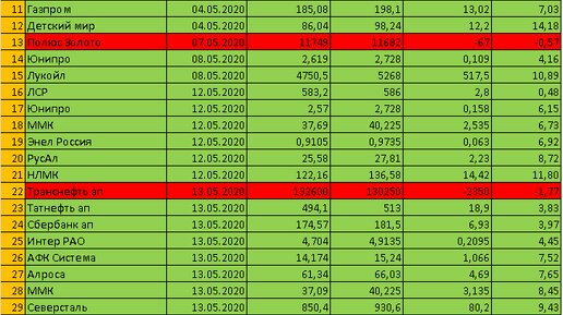 Друзья, всем привет! Завершился очередной торговый месяц, май 2020 года, и по традиции мы подводим итоги нашего долгосрочного инвестирования в акции российских компаний на Московской бирже. Сделки по инвестиционной стратегии по состоянию на 31 мая 2020 года В мае формирование долгосрочных позиций осуществлялось исключительно на коррекциях и проливах по уровням, определяемым в ежедневном торговом плане. В результате в мае было отработано 48 торговых уровней по эмитентам, указанным в таблице. Из 58 отработанных уровней с конца апреля 2020 года в отрицательной зоне пока остаются 13 позиций...