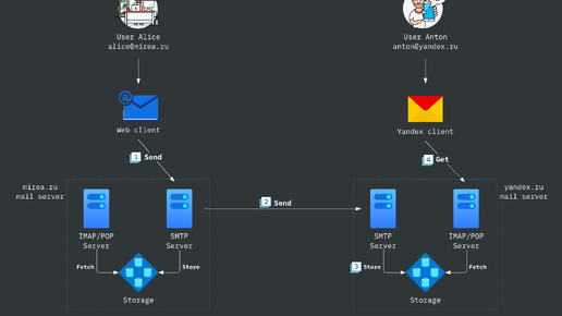 Рассмотрим ситуацию, когда один человек отправляет другому письмо. Для примера возьмем Алису, которая работает в учебном отделе и Антона, студента вуза. 1. Алиса входит в свой веб-клиент (mail.mirea.ru), составляет электронное письмо и нажимает «отправить». Письмо отправляется на почтовый сервер вуза. Протокол связи между веб-клиентом и почтовым сервером — SMTP. 2. Почтовый сервер вуза запрашивает DNS, чтобы найти адрес SMTP-сервера получателя...