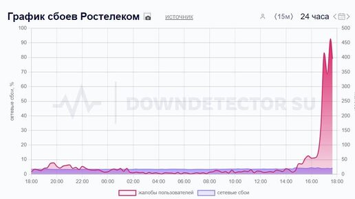 В России зафиксирован масштабный сбой в работе оператора связи и домашнего интернета «Ростелеком». Об этом свидетельствуют данные downdetector.su. За сутки портал зафиксировал 3,2 тысячи жалоб, а за последний час — 1,2 тысячи. 94% пользователей жалуются на общий сбой в работе «Ростелекома». «Сбой домашнего интернета», «"Ростелеком" сломался», «Я из-за вас работать не могу», «"Ростелеком", не работает интернет и телевидение», — пишут пользователи. Наибольшее...