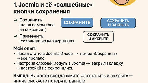 Когда я впервые установил Joomla, мне казалось, что это будет просто. Ну типа "WordPress, но чуть мощнее". А оказалось — это как прыгнуть в старый лифт без кнопок: непонятно, куда едешь, и выйдешь ли вообще. Но спустя часы боли, проб и ошибок, я всё-таки подружился с Joomla — и теперь расскажу, как выжить и даже полюбить эту систему. Если вы новичок, то первая же форма в админке Joomla станет вам ловушкой. 🔘 Сохранить — иногда сохраняет, но не всегда.