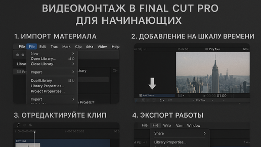 Введение Добро пожаловать в мир видеомонтажа! Это руководство создано специально для тех, кто делает свои первые шаги в программе Final Cut Pro. Мы вместе пройдем весь путь от импорта исходных файлов до сохранения готового ролика, разбирая каждый этап максимально просто и понятно. Не бойтесь, у вас все получится! -------------------------------------------------------------------------------- 1. Знакомство с интерфейсом и структурой проекта 1.1. Основные окна программы Интерфейс Final Cut Pro состоит из четырех ключевых рабочих областей...