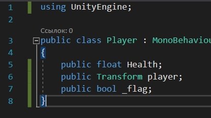 Но мы с вами поговорим сегодня не просто про работу с полями, а про работу с полями в Unity! Ошибки при работе с полями Как правило в компонентах мы часто определяем поля, ведь совокупность значений этих полей определяет состояние нашего объекта. Давайте разберем с вами небольшой пример. Сверху вы можете видеть скрипт игрока...