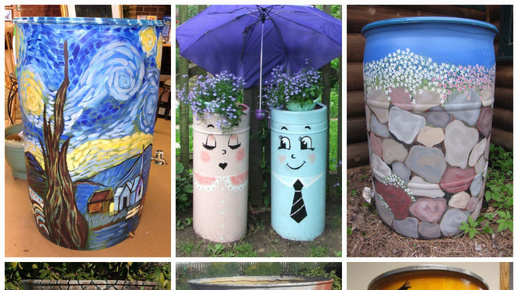 У меня в огороде есть две скучные железные бочки для воды. И есть множество идей, как их задекорировать. Но каждый раз время хватает только на то, чтобы покрасить их в один цвет.))) Наконец, решила закрыть этот вопрос и выбрать один из вариантов. Поможете? Поделюсь, какие идеи на этот счёт у меня уже есть: 1. Весёлые человечки Самый простой и забавный вариант. Вот только не стоит сразу рисовать краской. При всей простоте рисунка, лучше сначала сделать набросок мелом, чтобы получилось приятное выражение лица, а не наоборот...