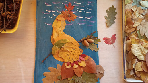 Идея поделки - аппликации из природных материалов. Жар птица из листьев