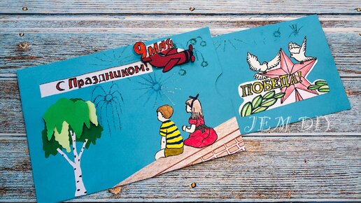 Смастерили мы с детьми необычную открытку к 9 мая. Предлагаю вам пошаговый мастер-класс! Необходимые материалы: цветной картон -1,5 листа одного цвета и небольшой кусочек другого, ножницы, клей, белая и цветная бумага, фломастеры и карандаши, двусторонний скотч тонкий и толстый, линейка, клей -гель с блестками или блестящие ручки (можно заменить клеем пва +блестки). Теперь нам нужно сделать «вставку», то есть среднюю часть. Берём такую же половинку картона, и обрезаем ее так, чтобы она свободно входила в серединку открытки...