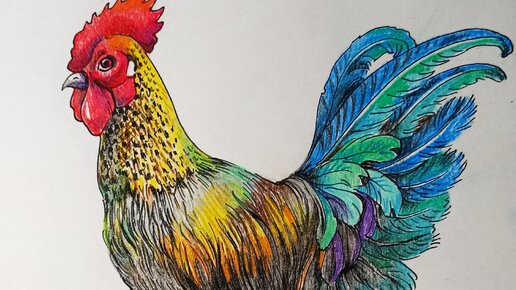 Как нарисовать петуха цветными карандашами | Рисунок поэтапно для детей