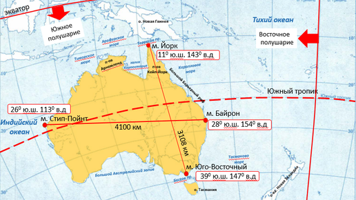 Австралия - самый маленький материк на Земле, ее площадь составляет 7,6 млн. кв. км. Австралия относительно экватора полностью расположена в южном полушарии. Относительно нулевого меридиана - в восточном полушарии. Южный тропик пересекает Австралию почти по середине. Самая северная точка - мыс Йорк. Мыс был назван Джеймсом Куком в честь герцога Йоркского. Самая южная точка Австралии - мыс Юго-Восточный, или Саут-Ист-Поинт, расположена на северном берегу Бассова пролива. Мыс Байрон, крайняя восточная...