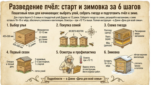 С чего начать разведение пчёл и что купить сразу Для разведения пчел я считаю удачным стартом 2–3 семьи в однокорпусных дадановских ульях на 12 рамок 435×300 мм. Эта схема улья понятна, детали доступны, а наращивать силу просто магазинными надставками. На зиму оставляйте 16–18 кг мёда, делайте утепление и лёгкую вентиляцию — так пчёлы зимой сидят спокойно и не сыреют. Осмотры проводите в солнечную безветренную погоду при температуре не ниже +15 °C — это базовый ритм для начинающих. Утренний улей пахнет воском и чуть тёплым прополисом, слышно ровное гудение...