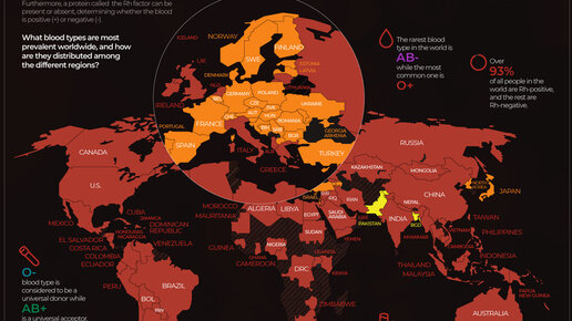 В современном мире принято выделять четыре группы человеческой крови (система AB0) и два типа резус-фактора (Rh). Именно сочетание этих признаков определяет один из восьми возможных типов крови у человека. Ресурс Visual Capitalist подготовил инфографику, наглядно показывающую, какие группы крови являются самыми популярными в разных странах и регионах мира. Самая распространенная - первая положительная группа крови (0+) — ее носителями являются 39% всех людей на планете (примерно 3 млрд человек)...