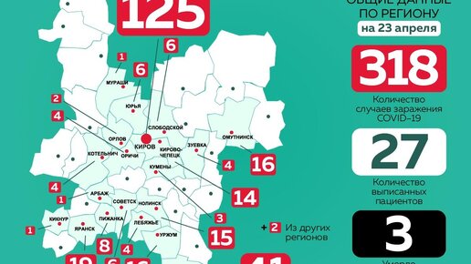 Общее число заболевших коронавирусом на 23 апреля в Кировской области достигло 318 человек. При этом по данным на 23 апреля количество выписанных в связи с выздоровлением пациентом составляет 27 человек. Новых фактов летального исхода не зарегистрировано. По-прежнему по количеству инфицированных COVID-19 в регионе лидирует областной центр...