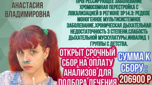 Здравствуйте.Помогите пожалуйста распространить информацию.Очень нужна ваша помощь! ❗Если у вас есть возможность перевести любую посильную сумму на реквизиты сбора, поставить лайк, сделать репост-пожалуйста сделайте это. Насте срочно необходимо сдать анализы благодаря которым будет подобрано лечение .Анализы необходимо сдать до 1 декабря.Осталось совсем мало времени что бы собрать сумму,но мы очень надеемся на вашу помощь и поддержку.Благодаря вашей помощи у Насти есть шанс продолжить борьбу за жизнь без боли и страданий!От этих анализов зависит жизнь девочки...