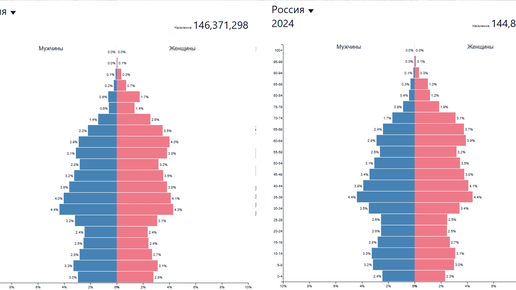 Ход работы: 1.Выберите две половозрастных пирамиды населения России разных лет. 2.Рассчитайте долю молодого населения (до 15 лет) в общей численности населения страны. (2020 г. :3,0%+3,3%+2,8%+2,8%+3,1%+2,7%=17,7% 2024 г. : 2,4%+3,2%+3,3%+2,3%+3,0%+3,1%=17,3%) 3.Рассчитайте долю населения среднего возраста (от 15 до 65 лет) в общей численности населения страны. (2020 г.: 2,5%+2,4%+3,2%+4,4%+4,0%+3,6%+3,2%+2,8%+3,1%+2,9%+2,4%+2,4%+ +3,1%+4,3%+4,1%+3,8%+3,5%+3,2%+3,8%+4,0%= 66,7 % 2024 г.: 2,8%+2,6%+2,6%+3,5%+4,4%+3,9%+3,4%+3,1%+2,6%+2,9%+2,8%+2,5%+...