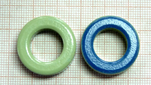 Сегодня получил от дядюшки Ху салатово-голубые ферритовые кольца. Первым делом посмотрел в таблице их проницаемость. Там же было написано, что материал 52 имеет меньшие потери на высоких частотах и такую же проницаемость, что и другой популярный материал 26. Широко используется при изготовлении дросселей фильтров, работающих на высоких частотах. А значит, что для контура на 3,5 МГц вполне может пойти. Но ведь дядюшка Ху такой затейник :)). Поэтому решил проверить его данные сам, тем более, что торец кольца был не столько голубой, сколько синий (на мой взгляд)...