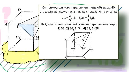 От прямоугольного параллелепипеда объемом 40 отрезали меньшую часть так, как показано на рисунке Найдите объем оставшейся части параллелепипеда. 1) 32; 2) 36; 3) 34; 4) 38; 5) 28. Задача централизованного тестирование 2021 года. Вариант 6...