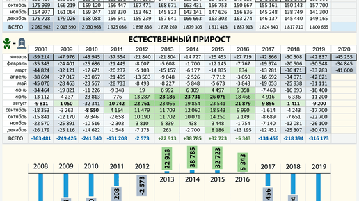 Жирным выделены максимальные значения за год, ячейкой - минимальные. Больше всего детей рождается в июле-августе; меньше - в январе-феврале. Максимальная смертность - январь; минимальная - август-сентябрь (кроме 2010 года, когда было аномально жаркое лето)...
