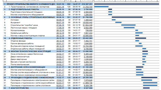 В этом примере продемонстрирован расчет плана производства строительства 12-этажного 3-х секционного жилого комплекса, показаны подходы к планированию этапов строительных работ, даны полезные рекомендации для упрощения процесса и улучшения качества планирования. Эта статья включена в раздел справки Budget-Plan Express – программного продукта для подготовки бизнес-планов в формате Word и Excel Пусть, общая полезная площадь 12-этажного 3-х секционного жилого дома 9753,12 кв. м. (36 одно- и двухкомнатных квартир площадью 38,71 и 67,51 кв...