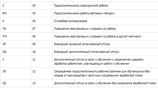 В статье представлена таблица условных обозначений табеля учета рабочего времени с буквенными и цифровыми кодами. Условные обозначения в табеле учета рабочего времени Какие буквенные обозначения в табеле учета рабочего времени используются и как они расшифровываются, приведено в таблице ниже. Большинство бухгалтеров считает, что для повседневного использования удобнее буквы в табеле учета рабочего времени. А при компьютерной обработке данных выгоднее пользоваться цифрами...