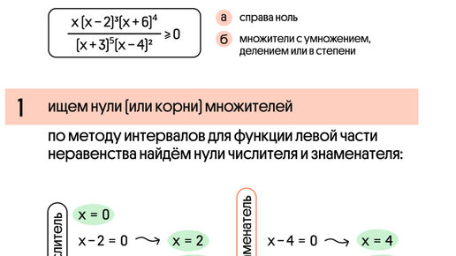 В одной из недавних моих статей был рассказан классический метод интервалов. Но я обещала поделиться с вами лайфхаками! Итак, оказывается для определения знака на интервалах не обязательно проводить довольно рутинные вычисения. Можно поступить проще. 1. Определяем знак на крайнем справа интервале (помните, я говорила, что эта привычка нам пригодится). Сделать это можно, определив знаки каждого коэффициента, стоящего перед неизвестным, которое находится в самой большой степени (знак старшего коэффициента) в каждом множителе...