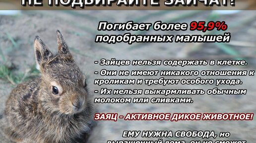 Ежегодно центры диких животных получают несколько тысяч обращений по зайчатам. Некоторых удается вернуть на место, других - передать специалистам, а третьи остаются в руках человека, но это не всегда хорошо. 1. Что делать, если увидели зайчонка в природе? Если детеныш сидит на месте, замирает, возле него нет пожара, он не находится в зоне движения автомобилей, на него не напала собака - то помощь ему не нужна! Пройдите мимо, никак его не трогая. Мама кормит зайчат в одном месте, в одно и тоже время...