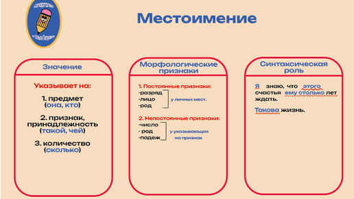 Как сделать морфологический разбор местоимений? Такой вопрос может возникнуть у школьников или у родителей, которые хотели бы помочь своим детям в выполнении домашнего задания. В этом коротком посте я расскажу Вам как. Прежде всего, нужно вспомнить все морфологические признаки местоимений, их синтаксическую роль в предложении (в этом помогут мои Шпаргалки + оставляю ссылки на видео). Затем – порядок разбора. И готово! Вот порядок разбора. 1. Указываем часть речи и на что указывает местоимение...