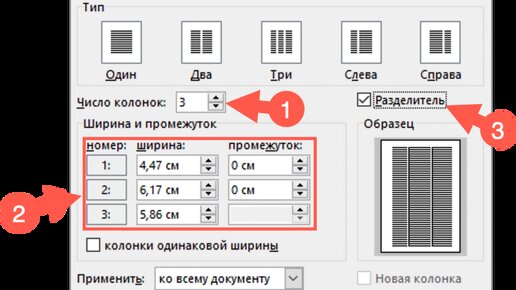 Для разделения текста на столбцы/колонки в Word имеется встроенный инструмент. Находится на вкладке Макет и называется Колонки. Мы можем либо выбрать подходящий вариант из меню, либо задать параметры вручную, выбрав последний пункт Другие колонки. Здесь можно задать до 12 колонок (1), а также определить ширину каждой из них в сантиметрах (2). Если нужно отделять колонки друг от друга разделителем, то используем соответствующий чек-бокс (3). У этого способа есть ряд нюансов. Так, если мы создаем...