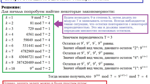 Найти остаток от деления на 7 числа 9^2018. Хитрость задачи в том, что ваш калькулятор не посчитает вам это число из-за битового переполнения. Поэтому нужно находить это вручную, используя и обобщая некоторые закономерности...