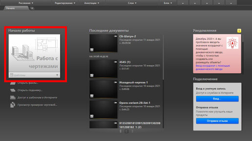 При запуске автокада вы попадаете в меню "Начало", в нем можно выбирать шаблоны и указывать путь к открываемым файлам. Но сейчас мы не будем ничего менять, а просто запустим шаблон по умолчанию, нажав на иконку "Работа с чертежами"...