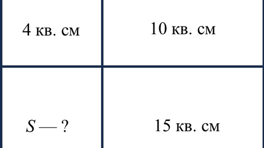 Друзья, разберём решение задачи, которая вызвала немного споров. Прямоугольник разбили на четыре маленьких прямоугольника, как показано на рисунке. Площади трёх маленьких прямоугольников равны 4 кв. см, 10 кв. см и 15 кв. см. Чему равна площадь четвёртого маленького прямоугольника? Многие решали методом подбора. Уже очень здесь прямоугольник площадью 4 кв. см похож на квадрат. Найдя его сторону — 2 см, нетрудно получить результат. Однако, в задании вовсе не утверждается, что этот прямоугольник квадрат и длины сторон не обязательно должны быть выражены натуральными числами...