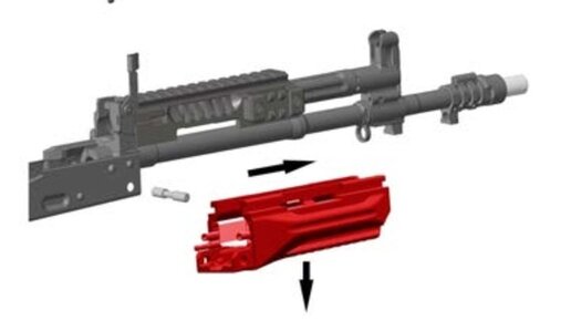 Как известно, АК-12 имеет т.н. "вывешенное" цевье, способ крепления которого отличается от предыдущих версий. Цевье надевается на выступы накладки и от продольного перемещения фиксируется в ствольной коробке при помощи оси цевья и пластинчатой пружины, закрепленной в экране. Для снятия цевья необходимо выколоткой, через отверстие в нижней части цевья, нажать на пластинчатую пружину, затем сдвинув ось в любую сторону и вынуть ее. При обратной сборке перед установкой оси ОБЯЗАТЕЛЬНО требуется снова ОТЖАТЬ пружину и только ПОТОМ вставлять ось...