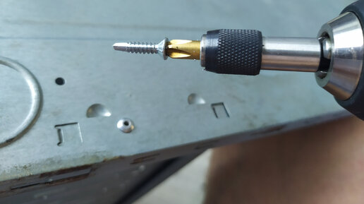 Всем привет, сегодня решил разобрать старые корпуса системного блока, чтобы сэкономить место в шкафу. В качестве соединения в корпусах использовались заклёпки. Передо мной сразу встала задача как это сделать, ранее я никогда это не делал. Я поискал информацию в интернете, там мне сказали, что заклёпки можно высверлить. К сожалению, подходящего сверла по металлу у меня не было, но были саморезы по металлу со сверлом. В общем, все очень просто, берем шуруповёрт, берем саморез, и вкручиваем его в центр заклепки...