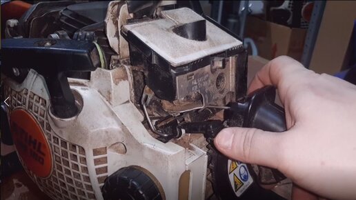 Принесли в ремонт бензопилу штиль 180, у которой была проблема с переключением воздушной заслонки. Рычаг постоянно выскакивал из паза корпуса бензопилы, иногда не получалось заглушить пилу, или перевести в какое-то из положений. Проблема эта не редкая, появляется при износе самого рычага управления, или при износе паза в котором он сидит. При переключении воздушной заслонки в нижнее положение (заслонка закрыта, холодный пуск) некоторые люди не зажимают газ, это фатальная ошибка, она и приводит к подобным неисправностям...