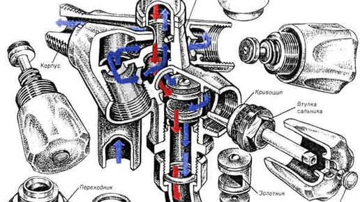 В этой инструкции мы познакомимся со всеми видами протечек и способами решения проблем, не вызывая специалиста. Как устроен смеситель? Несмотря на внешнее разнообразие, конструкция практически ничем не отличается. С одной стороны находятся шланги с горячей и холодной водой, с другой - излив с аэратором и рукоятки для управления. Чем смесители отличаются внешне, видно сразу - количеством вентилей: Исходя из внешнего различия этих смесителей, разные устройства перекрывают воду: Почему смеситель ломается?...