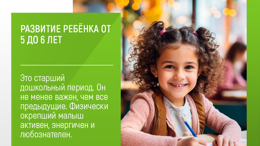 Ключевые моменты Даже когда дети начинают ходить в садик и в подготовительную школу, семейные отношения по-прежнему оказывают самое важное влияние на развитие ребенка. В 5-6 лет ожидайте сложных эмоций, независимости, дружбы и социальных игр, много разговоров, улучшения физической координации и многого другого. Для развития детей полезно играть с вами, выполнять простую работу по дому, практиковаться в поведении в группе, устраивать игры и говорить о чувствах. Поговорите со своим педиатром, если вас беспокоит развитие вашего ребенка или вам нужна поддержка...