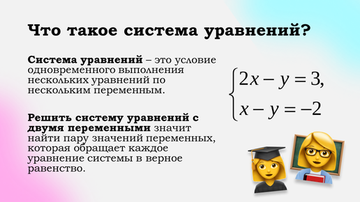 Время чтения: 7 минут. Сегодня мы разберем, что такое система уравнений и какие существуют методы ее решения: быстро, кратко, понятно🧠 То есть, по итогу решения системы у нас будет пара значений x и y, которые мы можем подставить в два уравнения и получить верное равенство. Способы решения систем уравнения: Ниже разберем каждый метод подробнее. 1. Графический метод решения Чтобы решить систему графически, нам нужно: Таким образом, решением данного уравнения будет являться точка (3;2), то есть x=3, y=2...