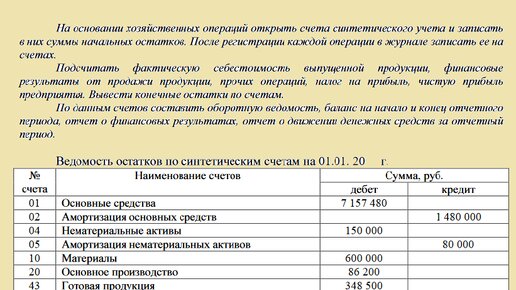 Как решать комплексную сквозную задачу по теории бухгалтерского учёта? Решение любой задачи начинается с прочтения задание, что позволяет сформировать условие - что дано и сформировать вопрос - что должны получить в итоге. Ответы на эти вопросы позволяют выстроить решение задачи. Чаще всего из практики выстраивается следующий алгоритм решения задачи: В разных вариантах работ начинаем или с определения синтетических счетов к представленным статьям или сразу с формирования бухгалтерского баланса на начало периода...