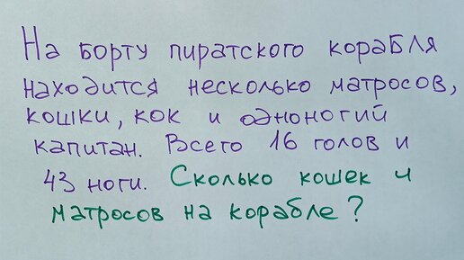 Эту задачку, мне кажется, дают рано или поздно в каждой школе. Вариации могут быть разные. Необязательно про пиратов, иногда она по скотный двор, гусей и собак, коров и пастухов, иногда про роботов и так далее...