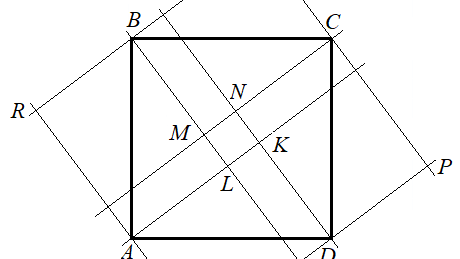 Рассмотрим решение несложной задачи, варианты которой для учащихся можно множить способом, указанным ниже. 1. Дан квадрат ABCD. Через его вершины провели четыре параллельные прямые и четыре перпендикулярные им прямые. При пересечении построенных прямых образовались два квадрата: KLMN и PQRS (см. рис.). Найдите сторону квадрата ABCD, если сторона квадрата KLMN равна 1, а сторона квадрата PQRS равна 7. Решение. Взаимно перпендикулярные прямые при пересечении со сторонами квадрата образуют прямоугольные треугольники с гипотенузой, равной стороне квадрата...