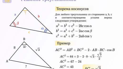 Как решить треугольник и что это вообще значит? Решить треугольник - значит найти все его элементы, то есть все стороны и все углы. В прямоугольном треугольнике чаще всего для этого служат: 1) Теорема Пифагора 2) Соотношение сторон и углов через тригонометрические функции (синус, косинус, тангенс и котангенс) А что делать в обычном треугольнике? Всё просто - для этого существует 2 чудесные теоремы, которые позволяют решить ЛЮБОЙ треугольник: 1) Теорема синусов (привожу вариант НЕ расширенной...