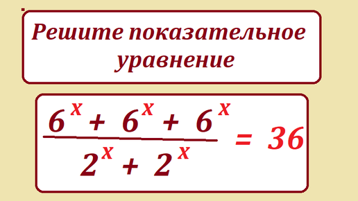 Приветствую читателей и подписчиков канала Тесты_математика! Рассмотрим решение на первый взгляд элементарного показательного уравнения. Задача. Решите показательное уравнение (6^x+6^x+6^x)/(2^x+2^x) = 36. Несмотря на то, что решение уравнения показано на скриншотах с экрана видео, и в самом видео, кратко опишем решение уравнения. (6^x+6^x+6^x)/(2^x+2^x) = 36; 3 * 6^x/2 * 2^x = 36; 6^x/2^x = 24; Используя свойство показательных функций, применяем его к выражению: 6^x/2^x = (6/2)^x = 3^x...