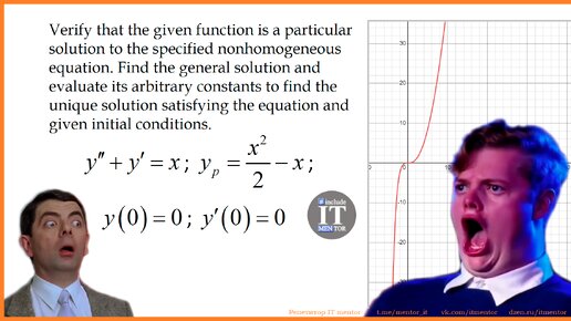 Привет, мои любимые читатели! Сегодня вспомним математический анализ, потренируемся решать классические диффуры, пугающие студентов второго курса физ-мата. Основная ошибка при решении такого дифференциального уравнения связана с тем, что 95% людей будут искать частное решение в виде правой части, т.е. в виде линейной функции y = A⋅x + B. Но тогда первая производная получается y' = A, вторая производная y'' = 0, а при подстановке мы получаем A = x, что странно, ведь мы должны получить тождество, а его нет...