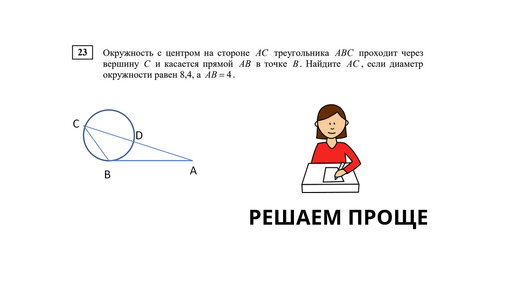 В тренировочной работе геометрическая задачка 23 была очень простой. Но в ней был момент, который не позволили решить ее до конца многим ученикам. Разбираем типовое решение и ищем альтернативу. Для начала сделаем рисунок к задаче. Начнем с окружности, далее нарисуем касательную, а точку касания обозначим В (ведь окружность касается в вершине В по условию). Затем на касательной отметим точку А и из точки А проведем прямую, проходящую через центр окружности. На этой прямой поставим точку С такую, что она является точкой пресечения прямой и окружности...