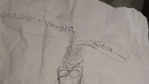 Это было прикреплено в комментарии, под какой-то статьей, тогда видемо пропустила. Вообще рисунок вашей дочери, скорее похож на рисунок-тест "Несуществующее животное". Давайте сначала по фразе вашей дочери - вот сама по себе фраза "слишком много добра" - вроде бы на первый взгляд безобидная. Но она может отражать чувство подавленности, указание на чрезмерную опеку, контроль, и какие-то моральные воспитательные требования - веди себя хорошо, будет хорошей девочкой, будь паинькой и так далее). Так...