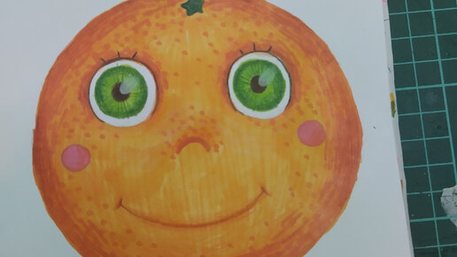 Давно хотела нарисовать такой мандарин. Последнее время больше рисую маркерами. Они сааамые обычные, которые между собой плохо смешиваются, и похожи больше на фломастеры. Но они мне очень нравятся, насыщенные, много цветов.. Первым шагом был рисунок карандашом, его я не успела сфотографировать. И далее я выбрала подходящий цвет маркера для мандарина. Покрыла им фрукт, глазки раскрасила зелёным цветом, наметила румянец. Добавила точки маркером, и создала...