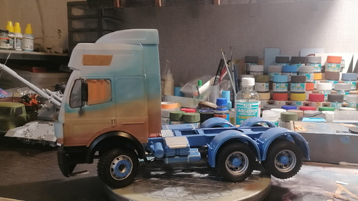 Всех приветствую! Ну что, думали Мерс постарше уже ушел на покой? Ничего подобного! Как и говорил ранее вся дальнейшая работа по Мерседесу оттормаживает  рисунок на кабине. Но процесс сдвинулся с мертвой точки.  Вот как то так начинается окрас кабины грузовика- с надписей карандашом в какие цвета и примерные границы цвета. Вот как то так примерно уже появляются цвета на кабине...
