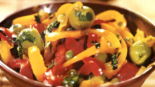 Ингредиенты: Красный перец - 4 шт. Желтый перец - 3 шт. Зеленый перец - 1 шт. Чеснок - 2 зубчика Оливковое масло - 4 ст. ложки Оливки (или маслины) без косточки - 15-20 шт. Петрушка Соль, перец Приготовление: Перец вымыть, удалить сердцевину. Нарезать полукольцами. Чеснок измельчить и обжарить на разогретом масле примерно 1-2 минуты. Добавить перцы, посолить и перемешать...