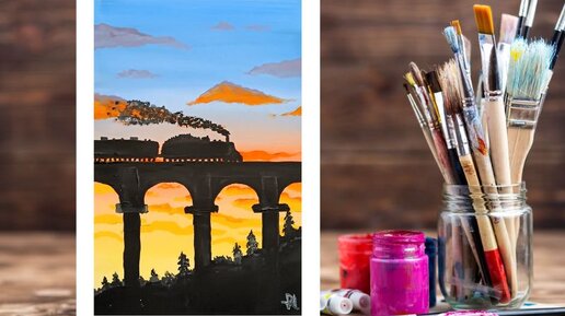Силуэт поезда. Рисуем гуашью легко и понятно.