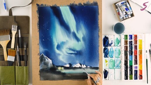 Содержание Материалы Шаг 1. Набросок Шаг 2. Основные заливки Шаг 3. Силуэт сияния Шаг 4. Звезды и горы Шаг 5. Огни Шаг 6. Детали На уроке Дарьи Куцаевой, мастера акварельной живописи, вам предстоит нарисовать северное сияние в ограниченной палитре цветов. Мы будем работать по-мокрому, набирая очень густой темный колер для черного неба, а само сияние будет совсем светлым. Очень важно добиться мягких касаний, чтобы возник эффект переливов на небе. Также добавим несколько звезд, для чего возьмем темперные белила...