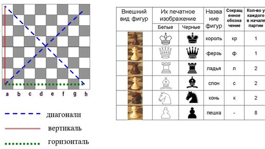 Печатное или рисованное изображение доски называется диаграммой. Выбор партнерами цвета фигур определяется жребием. Игру начинают всегда белые. Обозначения ходов: Именование клеток. Для удобства выражения и записи ходов в шахматной нотации клетки доски обычно нумеруются...